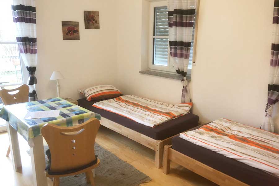 Das Zimmer ist ein 25m² großes Nichtraucher-Doppelzimmer. Es ist mit getrennten Betten, einem Fernseher und einem kleinen Kühlschrank ausgestattet. Das Zimmer verfügt über ein Badezimmer mit Dusche/WC. Die Gemeinschaftsküche werden mit den beiden anderen Zimmern geteilt. Die Küche ist voll ausgestattet.